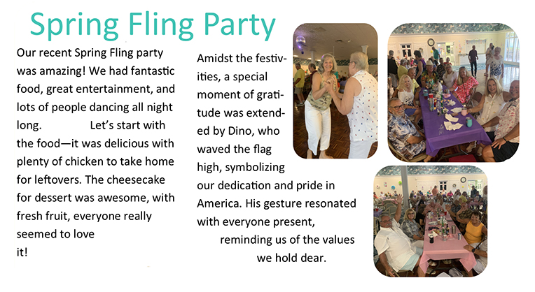 Our clubhouse is the gathering place in our community for committee meetings, social events, or just to relax with friends.  In our clubhouse, we support a furnished kitchen, large inlaid teak dance floor with a surround sound system, library, exercise room, Billiard room and a card room.  Outside is a large swimming pool, spa and shuffle board courts.